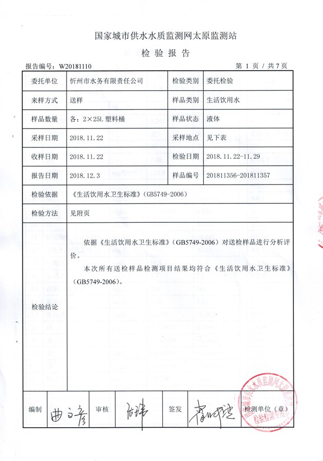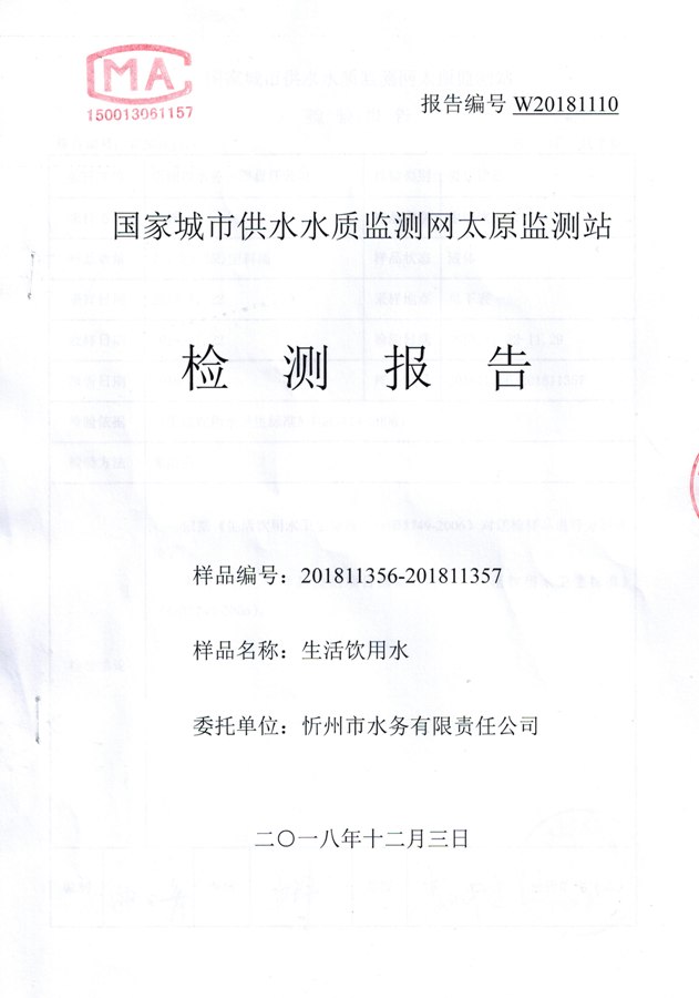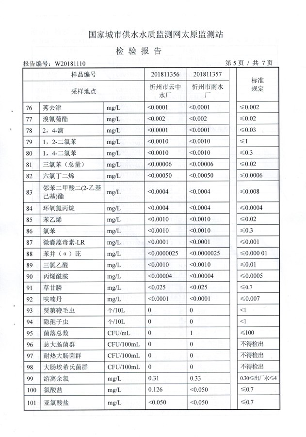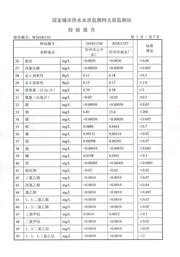 2018年忻州城區(qū)公共供水南水廠、云中水廠出廠水106項(xiàng)水質(zhì)全分析信息公示