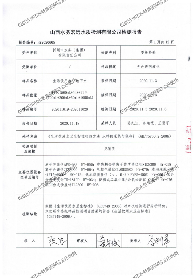忻州城區(qū)公共供水水源水、出廠水、管網(wǎng)水、管網(wǎng)末梢水2020年11月份水質信息公示