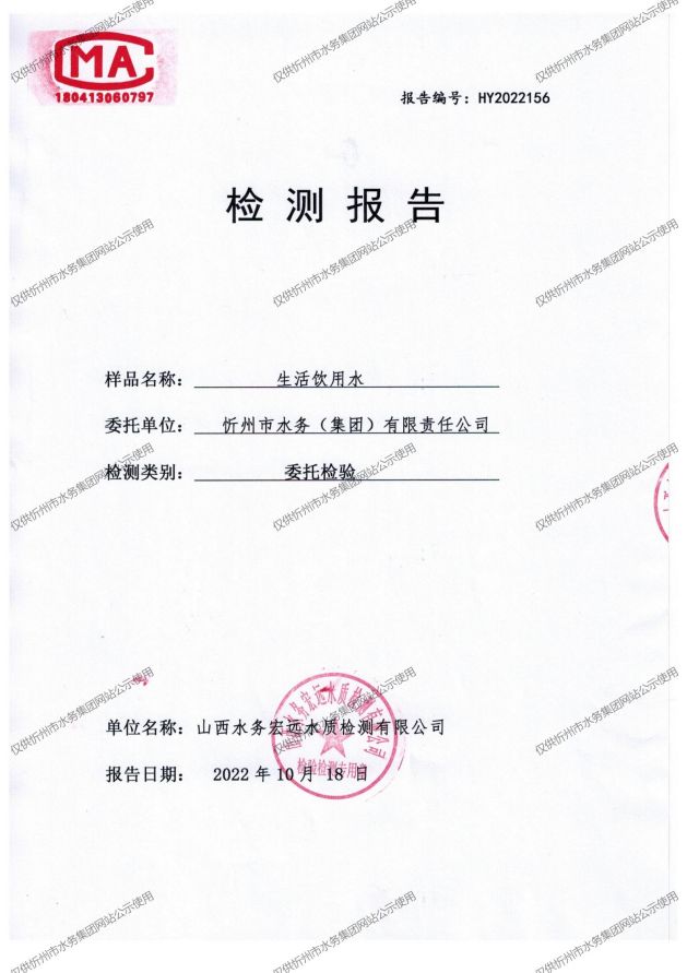 忻州城區(qū)公共供水水源水、出廠水、管網(wǎng)水、管網(wǎng)末梢水2022年10月份水質(zhì)信息公示