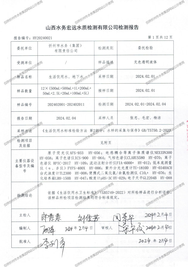 忻州城區(qū)公共供水水源水、出廠水、管網(wǎng)水、管網(wǎng)末梢水2024年2月份水質(zhì)信息公示